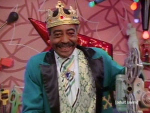 King Cartoon is high all the time. He's got to be. He talks like slowed-down Neil DeGrasse Tyson. His eyes are always half-closed. He's obsessed with old Max Fleischer cartoons. And he thinks his taxi driver is his royal herald and coachwoman. He seems like an old blues musician who smoked reefer.